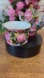 Black background with pink, blue, yellow, and green floral chintz pattern; white interior and gold trim