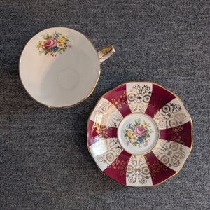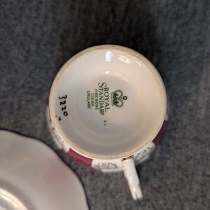 Royal Standard Cup & Saucer Set, Red/White Panel with Floral Design, #3220. In good used condition, with some wearing of the paint/trim on both the cup and saucer (see photos) but no cracks, chips etc. Cup measures 3.5" diameter, 2 3/4" tall; saucer measures 5.5" diameter.