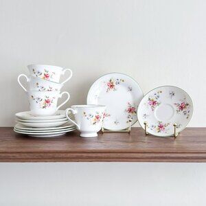 Vintage 12-piece tea set by Royal Vale, made in England. Features a lovely floral pattern with pink roses, violets, yellow blooms and pale green rim.