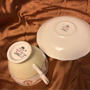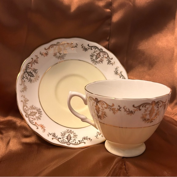 Royal Vale Teacup and Saucer softest butter yellow with gold chintz. Made in England This set is in very good condition, there’s a scratch on the plate back as shown in pic. Saucer measures 5.5" across and the teacup is 3.5" across brim. Perfect condition and pings true. This is a signed set.