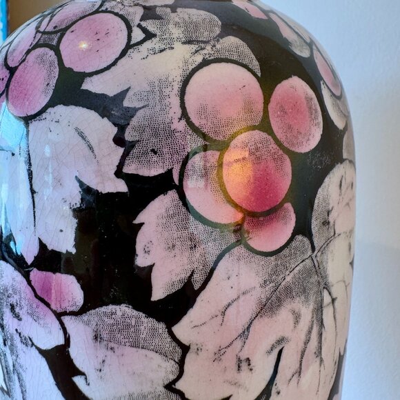 Royal Winton Grimwades Lustreware vase, made in Stoke on Trent, England in the 1940s. Black with fuchsia grapes and white leaves, gold trim that has faded. Vase measures 11.5 inches tall, opening at top is about 3 inches diameter. Cat friendly, nonsmoking home.