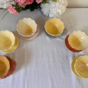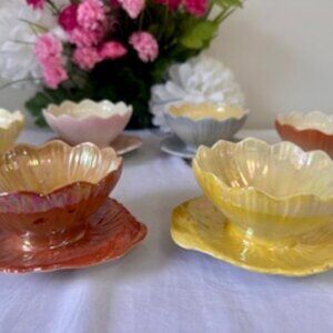 This exquisite set of six vintage Royal Winton ceramic flower-shaped bowls with matching underplates features a luminous lustre glaze in soft pastel tones. Each piece is delicately formed like a blooming flower and finished in a radiant iridescent glaze that catches the light beautifully — a true springtime delight.