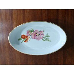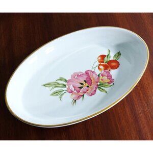A vintage Royal Worcester Fine Porcelain oven dish, in the Pershore pattern. Marked copyright 1978, oven to table ware. This pattern is a pink flower with red berries. In good vintage condition, with some wear to the gold trim. There is a dent or ´ridge´ in the bottom of the dish. it looks like it was produced that way (see last 2 images).