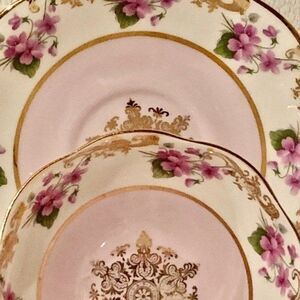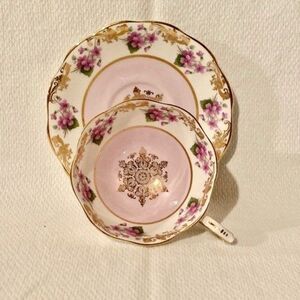 Gorgeous pink with light purple florals and lavish gold detailing and scrolls. No chips, cracks, crazing, repairs or stains. Cup and saucer ping well.