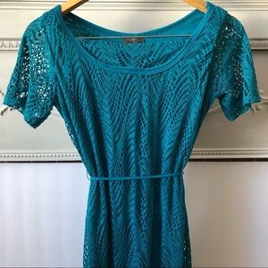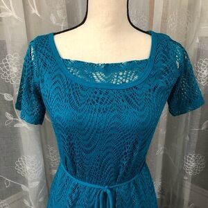 Roz & Ali Aqua blue dress size 10 - Beautiful almost brand new aqua blue dress, turquoise in colour. Long BoHo style dress with belt, short sleeves and mesh type print. 95% polyester and 5% spandex, made in the USA. Dress has one small catch on the front but can be easily fixed or removed.
