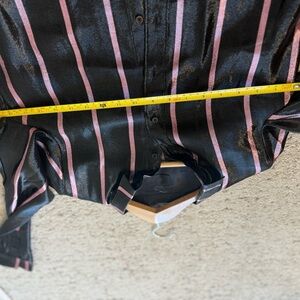 RtA NWOT XS Glossy black blouse featuring pink stripes. Button-up design. Long sleeves with a classic collar. Silk blend/ stunning structure
