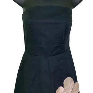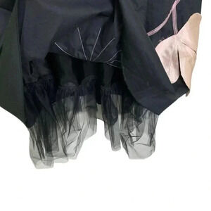 Elegant and feminine black fit and flare strapless dress with large pale pink flowers. The structured bodice provides a flattering fit, while the layered tulle underskirt adds volume and style. This dress is perfect for cocktail parties, special occasions, or evening events.