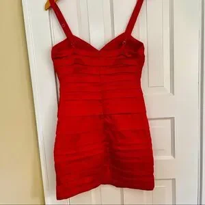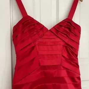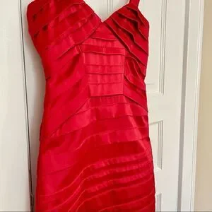 Rubber Ducky Productions Inc. strappy red cocktail dress, adjustable straps, very flattering bodycon. Standout from the crowd, textured with tiered layers as seen in pics. In very good pre-owned condition.