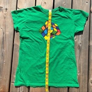 This Rubik's Cube shirt for women in size large features a Kelly Green graphic on a classic short sleeve tee. Made from 100% cotton jersey fabric, this pullover shirt is perfect for casual occasions, travel, or parties. The shirt is machine washable and designed with a crew neck and regular fit for comfortable wear. Whether you're into retro 80s style or just love solving puzzles, this Geek-themed shirt is a fun and stylish addition to your wardrobe.