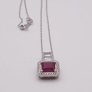 Gorgeous 925 sterling silver pendant + 16 inch chain, featuring beautiful prong set rectangular cut 1.45 carat natural ruby-glass composite main stone, three (3) channel set baguette cut cubic zirconia and twenty-six (26) shared prong set CZs (SIMULATING diamonds). The perfect gift for Christmas for your wife, daughter or girlfriend.