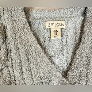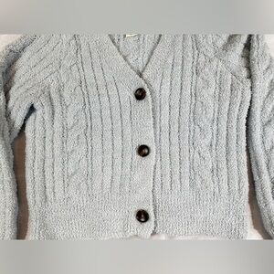 Plush light blue cardigan with a cozy knit texture. Ideal for layering.