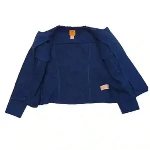 There are two chest pockets with decorative snaps. Each cuff features two snaps. There is a pretty ruffle along the zipper and round collar. This garmet is textured and unique.