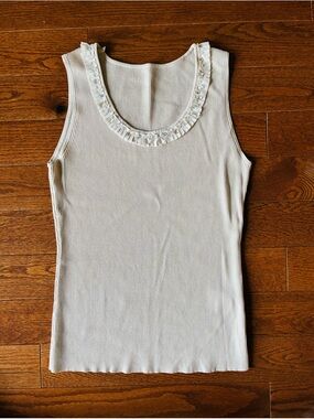 Sleeveless ribbed tank featuring a delicate ruffled scoop neckline. Soft, lightweight knit with subtle texture. Classic cream shade for easy styling. Simple, feminine detail at the collar.