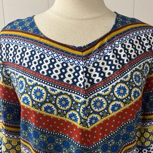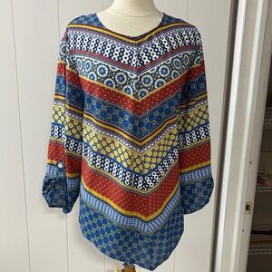 Stylish blouse with geometric patterns. Features red, blue, and yellow hues. Ideal for a bold look.