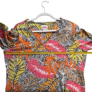Keywords: Ruby Rd top, Ruby Road Favorites, tropical print top, wrap style blouse, V neck top, colorful blouse, women’s size large, casual work top, stretch cotton blouse