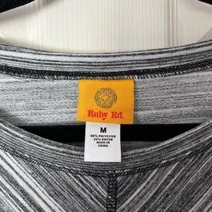 Ruby Rd. Top - black/white/grey color - beautiful striped design - round neck - fabric tie feature on the sleeves - small side slits - 20” inches pit to pit - 27” inches length - excellent preloved condition