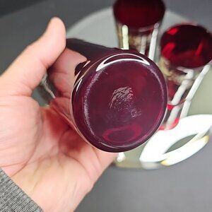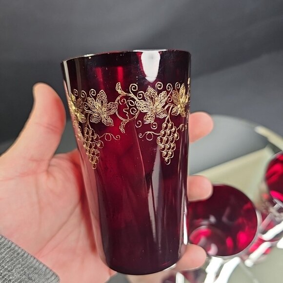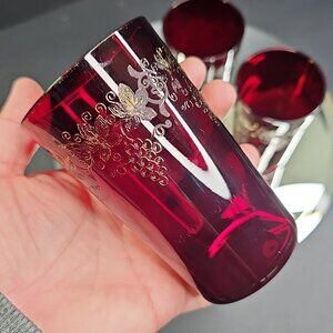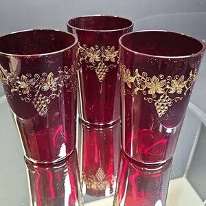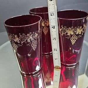 Ruby Red Cranberry Water Cups Etched Grapes Vintage READ