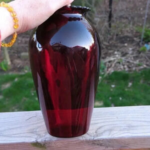 This is a quality made, lovely, ruby red glass hoover 9" vase with scalloped rim, in very good condition. It is without chips or cracks and shows very little surface wear. Please see all photos for detail.