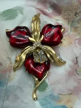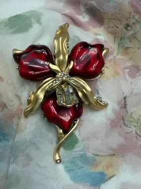 Bold red resin petals with gold-tone leaves. Accented with clear rhinestones for sparkle. Classic floral statement brooch. Versatile and eye- catching. It is 3” long.