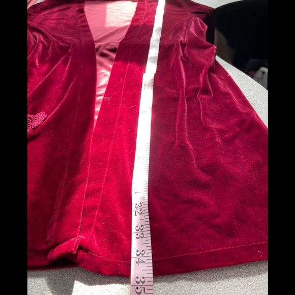 Ruby red Velvet or like a velour short light weight robe with crochet cuffs and on the arm. Comes with belt tie.
