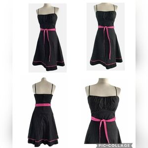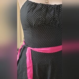 Black with white polka-dots, fushia accents. Mesh crinoline along the skirt bottom. Bust has padding, and straps are adjustable. Fun for a retro event, Halloween, car show dance, and more! Wish it fit me!