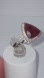 Top size 12 x 12 mm. Natural ruby stone, trillion cut size 8 x 8 mm, colour deep raspberry red, opaque. Side stones round cut white topaz. Made in sterling silver stamped 925 ring weight 2.57 gr. Ring size 7