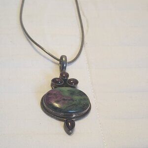 Based on the image, the pendant appears to be a ruby in zoisite gemstone, set in sterling silver. The smaller, darker red stones are likely garnets.