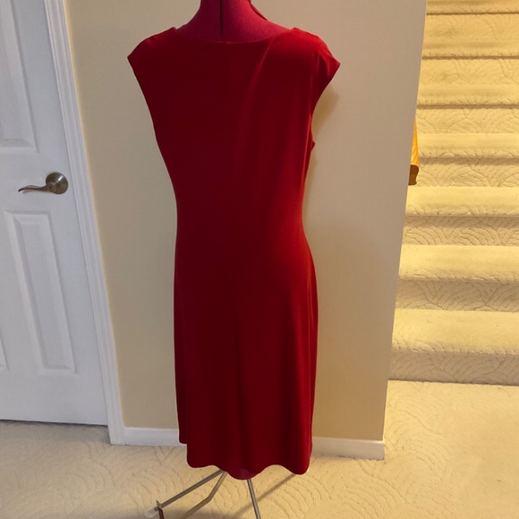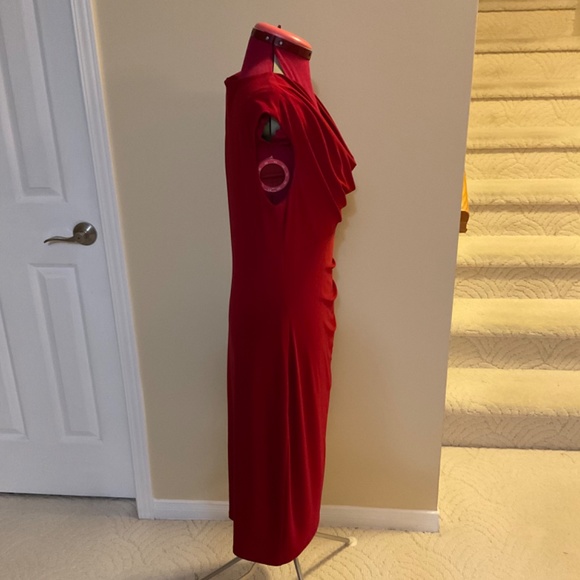 Stunning comfortable dress perfect for weddings , birthdays, celebrations of all types. Fully self line. Machine wash and hang to dry. Size 14. Polyester and elastase. Stretchy’, figure flattering and comfortable. Fits true to size.