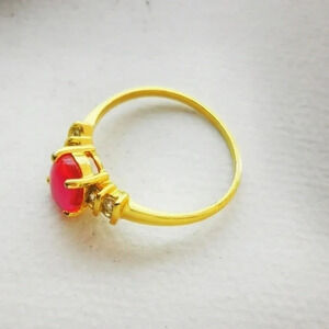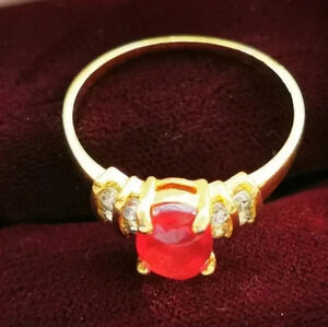 Synthetic ruby gold tone ring with clear stones absolutely stunning quality. Approximately size 9