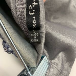 Strapless. Sparkles sequin top portion and silver metallic sheen to skirt portion with flattering pleated folds. Size 9. Pet and smoke free home. No rips tears or stains. 100% polyester but has some stretch.