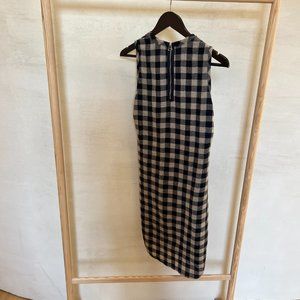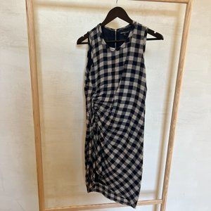 Ruched Checked Wool And Linen-blend Dress In Sand/french Navy