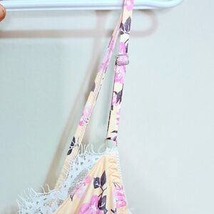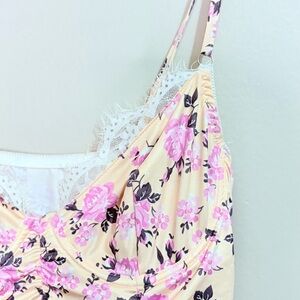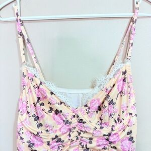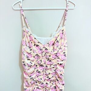 Ruched Cream Mini Dress w Pink Floral & Lace Trim Bustier Underwire