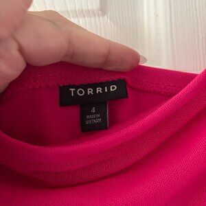 Hot pink ruched mesh midi length wiggle dress from Torrid. Straps are adjustable and the garment is extremely stretchy. This is a sexy dress that can accommodate a lot of sizes and body shapes. The hot pink colour is super fun for date night or a girls night out.