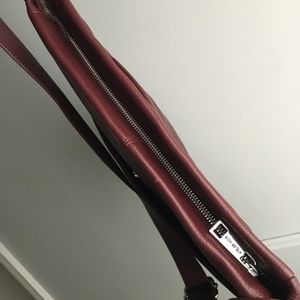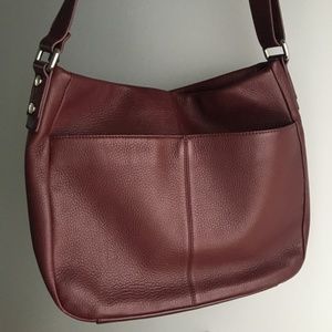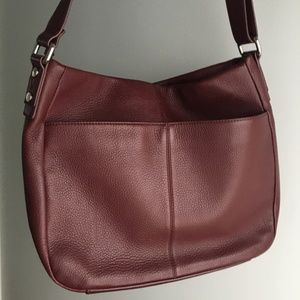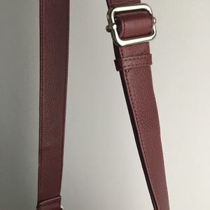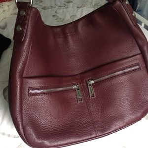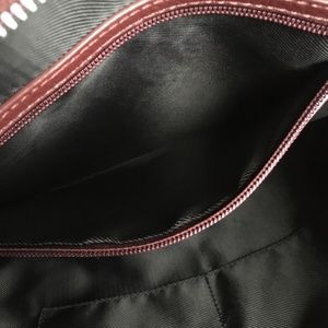 Burgundy colour, clean inside, lots of pockets, adjustable strap. Faint minor scratch as shown in last photo.