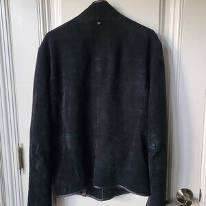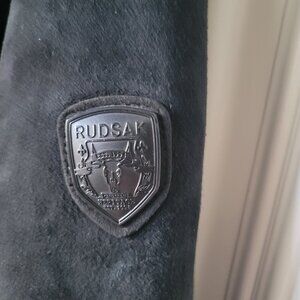 Rudsak, EUC, Mens Size M, but could be unisex, black 100% suede moto style jacket, with front zip pockets, assymetrical front zip, double snap closure at collar, leather trim. Heavy enough to wear during a milder winter. Beautiful jacket with no visible marks, stains or tears. Only sign of use is at the elbows from bending arm.