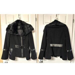 True to RUDSAK Design this Cropped Winter Jacket is a bit rebel and a bit lady π. Designed in Montreal. Soft Wool Blend of 80%Wool20%Nylon. Trim and adjustable belt in Genuine Leather. Dramatic Split Bell Sleeves with leather belted trim. Asymmetrical fill zipper closure. Removable Genuine Rabbit Fur Collar attaches with a zipper and stays in place with covered magnets at corners. Collar can be worn splayed or as a funnel neck. Quilted lining is 100% Nylon with 100% Polyester Fill. Cropped in front and back. Size is Small. Approx flat measurements: Chest19β, Waist17β,Hip20.5β,Sleeve24.5β, Shoulder17β, Length at centre back 24β.