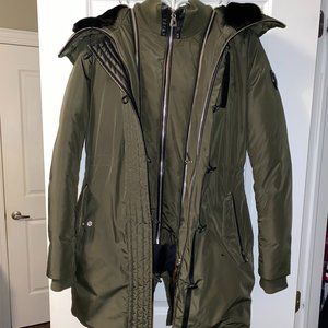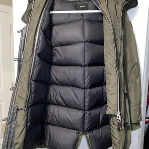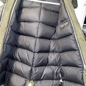 Very warm jacket for the winter! Loved it so much, especially the colour but grew out of it as it no longer fits. This was my casual jacket so the condition is very good. Inside vest is removable and you can tighten the jacket interiorly at the waist. The hood is lined with faux fur (which is very soft!) and has leather trimming.