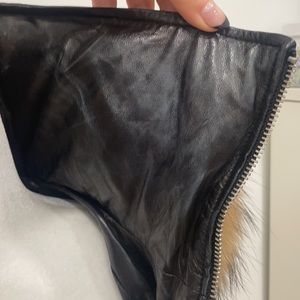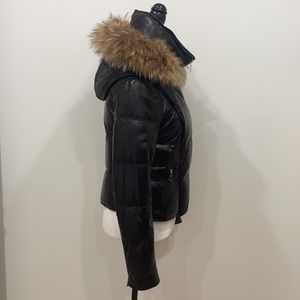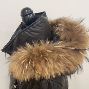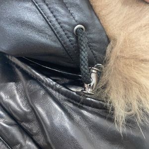 Fully leather puffer, with padding inside for extra warmth. It’s has beautiful raccoon fur at the hood and also hood is removable .