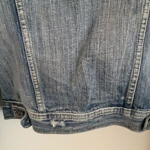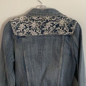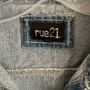 This Rue21 jean jacket features a classic blue denim enhanced with delicate lace accents for a stylish and unique look. The intricate lace detailing adds a touch of elegance to the traditional jean jacket design, making it a standout piece in any casual wardrobe.
