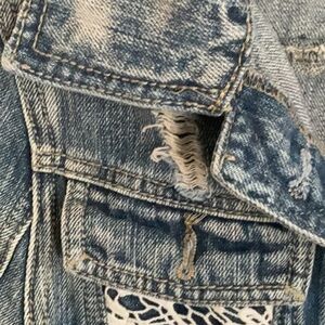 This Rue21 jean jacket features a classic blue denim enhanced with delicate lace accents for a stylish and unique look. The intricate lace detailing adds a touch of elegance to the traditional jean jacket design, making it a standout piece in any casual wardrobe.