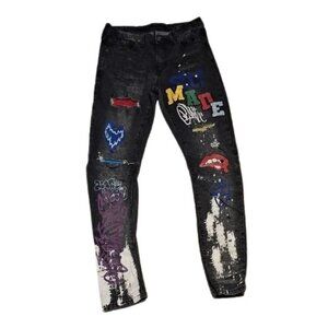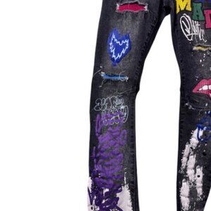 A pair of Rue21 Supreme Flex Skinny Arc Jeans, in black, with a dark fabric wash. Feature distressed elements, graffiti-style paint, and colorful graphic details, including text like "SELF MADE" and various symbols and abstract designs. Designed with stretch for comfort and a 5-pocket design.