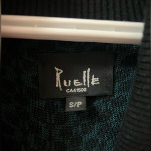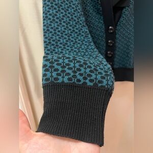 Women's Vintage Ruelle teal and black patterned knit cardigan. Features a contrasting black collar and button placket. Size small. Long sleeves. Button closure.