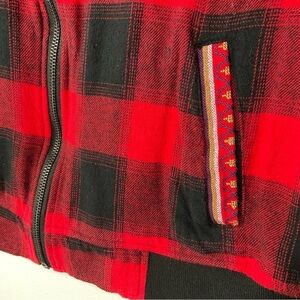 Ruff Hewn brand light cotton Spring jacket with red and black lumberjack plaid in a bomber style. Small, with gorgeous embroidered back and pockets detail. Western Boho Navaho Cowgirl Gorpcore Punk, this coat has it all