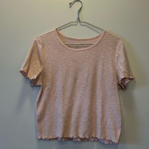 This ribbed blush pink cropped t-shirt combines comfort and style with its soft, flattering fit and delicate ruffle edge detail. Perfect for layering or wearing on its own, it adds a touch of feminine charm to any outfit.