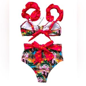 High waisted bottom with moderate coverage back and can be tied at front or back