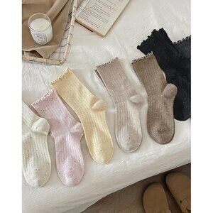 【Charming Ruffle Socks with Starry Dots】:These cute ruffle socks feature playful starry dot details for a whimsical touch. Available in two color sets: a sweet feminine palette of pink, yellow, and beige for a cheerful look, and elegant Melange hues of khaki, coffee, and black for a versatile, sophisticated style. With a charming lettuce edge, these lettuce edge socks combine cuteness and comfort, adding a fun flair to any outfit. Perfect for elevating your style effortlessly.