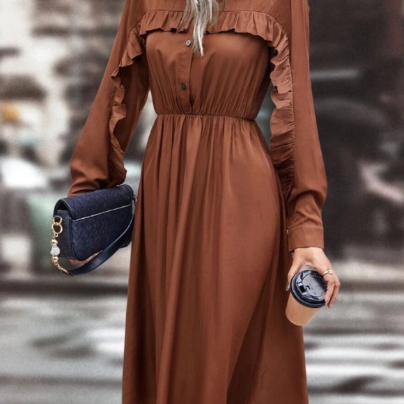 Super cute shirt dress from SHEIN. Midi length with attractive ruffle on sleeves and across top. Buttons down to elastic waist (18" across when stretched). Dress it up or down, versatile and comfortable. Looks great with or without a belt at the waist.