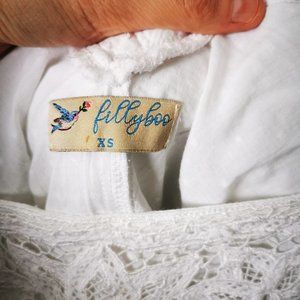 Stunning white ruffle and puff sleeve top with a drawstring for a tighter fit. It has one small discoloration that I've shown in the last phoot. Otherwise, it looks good.