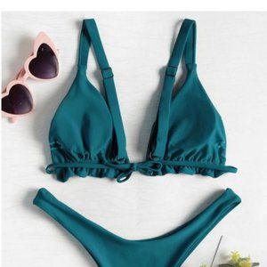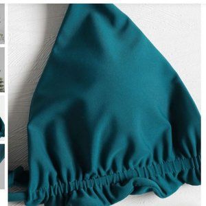 This is the bikini top only. I have a bottom that is fairly close in colour but not exact (last pic) from a different brand and that is on a different listing. The bikini top can slide along the string and the straps adjust so you can wear it the way you like. The colour is called peacock blue but it is a green/blue and I cannot get my camera to get the accurate colour. see the picture with the model for the accurate colour.