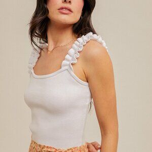 Feminine and flirty, this white knit cami top features soft ruffle detailing on the straps and a flattering body-hugging fit. Perfect for layering or wearing on its own through spring, summer, or early fall. Lightweight sweater-knit material offers comfort with a touch of stretch. Pair it with high-waisted skirts or denim for a sweet, casual look.